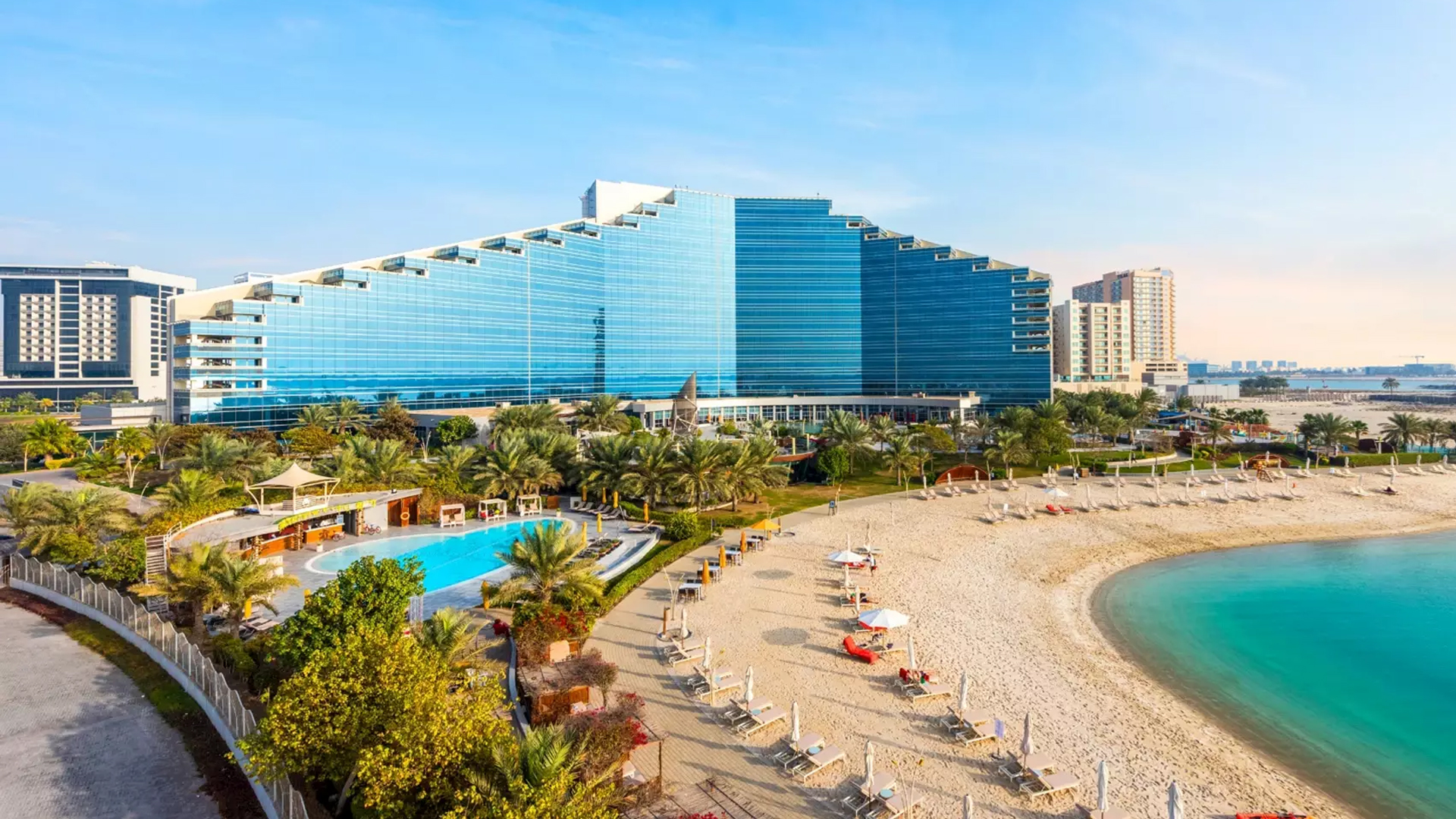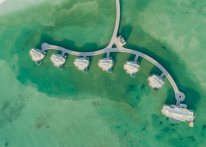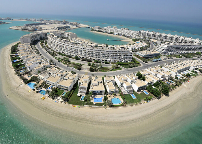 A group of man-made islands featuring luxury hotels, restaurants, and a marina.