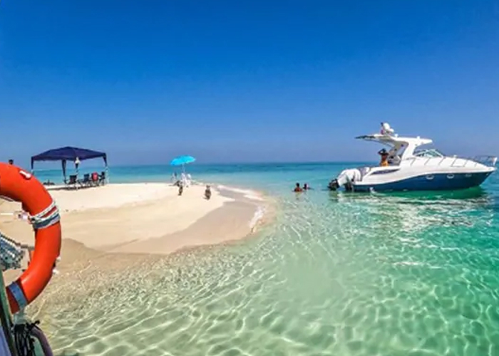 A "disappearing island" that is only visible during low tide, offering blue waters and a sandy beach for a boat trip.