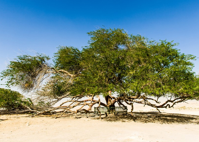 A lone mesquite tree over 400 years old, growing in the desert without an apparent water source. It has become a symbol of resilience and a popular photo stop.